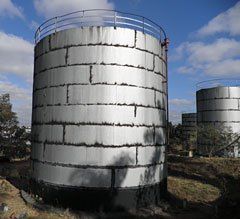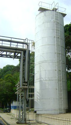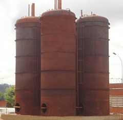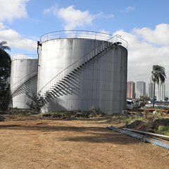 Tanques de armazenamento fabricados em aço carbono com capacidades variando entre 500m³ a 2.000m³.